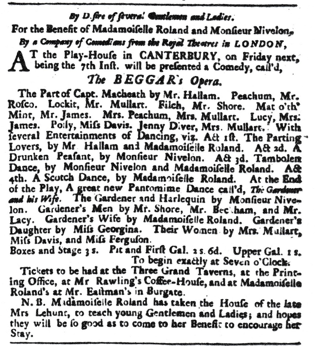 This brings me back to his short season in Canterbury, where Nivelon was billed as dancing with ‘a Company of Comedians from the Royal Theatres in London’ from 8 June to 28 August 1741. I list the newspapers in which the advertisements can be found at the end of this post. So far as I can tell, he gave eleven performances over that period, dancing a varied repertoire and partnering Mlle Roland. I think she was probably the French dancer Ann Roland, who made her debut at Drury Lane in 1735-1736, then moved to Covent Garden for 1737-1738 where she was still dancing in 1740-1741. (Her sister Catherine Roland followed a similar career in London – it is sometimes difficult to tell them apart in the Drury Lane and Covent Garden bills – but danced principally with Michael Poitier and seems less likely to have ventured to Canterbury to appear with a new partner).