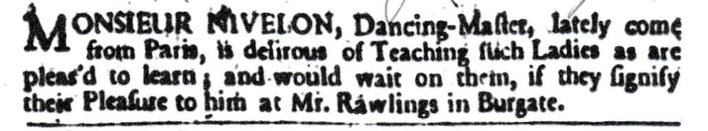 Nivelon was also advertised as teaching dancing while in Canterbury, albeit only once. Here is the advertisement in the Kentish Weekly Post or Canterbury Journal, 13 June 1741.