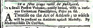 For the Further Improvement of Dancing is dated 1710 on its title page. The earliest advertisement I know is in the Tatler for 23-25 March 1710. A third edition was advertised in the Spectator (the successor publication to the Tatler) for 5 March 1712. I have not yet come across an advertisement for a second edition. Indeed, there is no explicit evidence for the successive editions in any of the surviving copies of this collection. The first edition was sold by the music publishers Walsh, Randall, Hare and Cullen, together with the author. According to the Spectator advertisement, the third edition was ‘to be had nowhere but at the Author’s House in Rood-lane, Fenchurch Street’. How should this be interpreted? Had Essex simply taken over the remaining copies printed in 1710 to sell himself as a ‘third’ edition? Or had he fallen out with the music publisher John Walsh, as others were to do later?