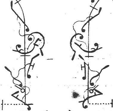 L’Abbé introduces an element of suspension, in the opening coupé sans poser with a one-beat pause (which comes at the end of the preceding musical phrase), before a pas composé which demands unhurried speed – a pas plié, changement and coupé soutenu to fourth position with a quarter-turn. There is then a coupé avec ouverture de jambe (also with a one-beat pause) before the pas composé is repeated. This sequence ends with another coupé avec ouverture de jambe and a pause, before the B section is completed with two pas balancés.