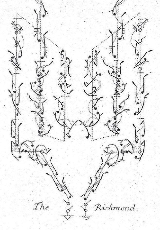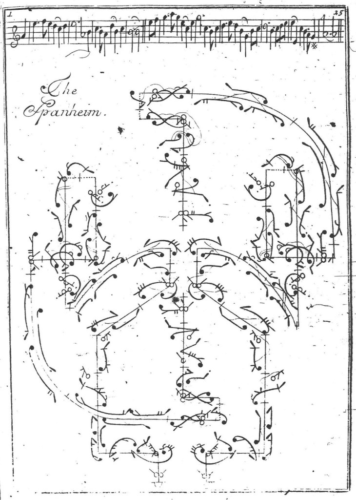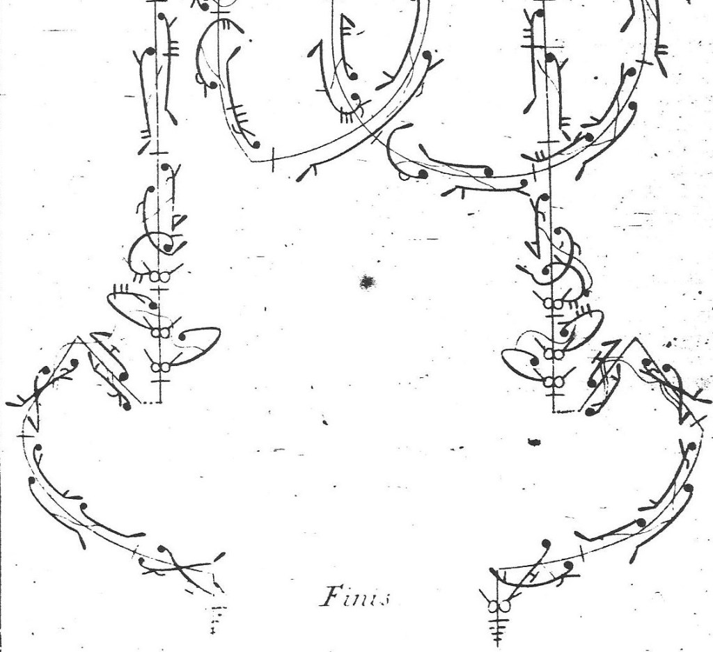 The Prince of Wales’s Saraband, as notated, is ostensibly an undemanding ballroom dance of 48 bars of music with the familiar AABB musical structure (A=10 B=14). The choreography is divided between four plates of notation (which by this time was Pemberton’s regular practice and probably reflects the expense of paper for printing). Plate 1 records the two A sections (20 bars of dance and music) and plate 2 the first B section. Plate 3 has bars 1 – 8 of the second B section and the dance ends on plate 4 with its final 6 bars. This division of the last section of the dance between two plates is dictated by the circular figures traced, which need to be shown separately so that they do not overlap, but also respects the musical phrasing. The layout on each plate may also reflect Pemberton’s aesthetic preferences – his notations for Isaac and L’Abbé include some of the most beautiful examples of this highly specialised genre of engraving.