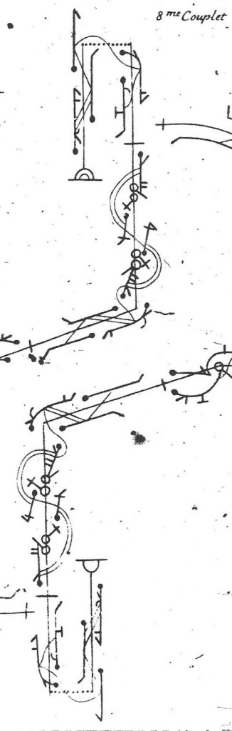 The step vocabulary of this dance is dominated by the pas de bourrée, with and without a final jetté, extending to the pas de bourrée vîte. There are also a number of variants of the coupé, including the coupé sans poser and the coupé avec ouverture de jambe. It is interesting that, throughout, L’Abbé uses the jetté and not the demi-jetté in pas composés. These add energy and prevent the dance from becoming languid. He also likes to pair steps, although where he repeats these pairings he often introduces an element of variation the second time.