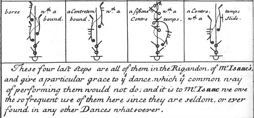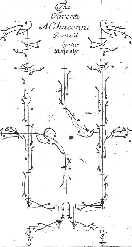 The Prince of Wales’s Saraband opens with a figure based around a temps de courante à deux, in which a temps is followed by a temps de courante, first on the inside foot and then on the outside foot. The notation indicates that the dancers turn their bodies towards the pointing foot on each temps, turning back towards the presence on each temps de courante. Did this mean that they turned their heads the same way or did they look steadfastly forward?