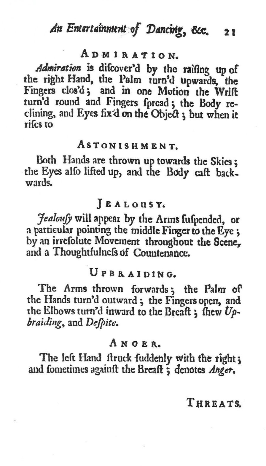 The scenario for The Loves of Mars and Venus has a Preface, in which Weaver explains his intention to introduce dancing ‘in Imitation of the Pantomimes of the Ancient Greeks and Romans’ to the London stage and apologises for the deficiencies in the performance of this ‘entirely novel’ form of entertainment. This is followed by a cast list, with mini-biographies of Mars, Vulcan and Venus. The action and the dancing in the afterpiece are divided into six scenes and described in detail. Another innovation is that Weaver adds descriptions of the gestures used in scenes two and six. Without this information, we would have little idea of his approach to expressive mime. Here is the description of scene two together with the first of the pages devoted to the gestures used by Vulcan.