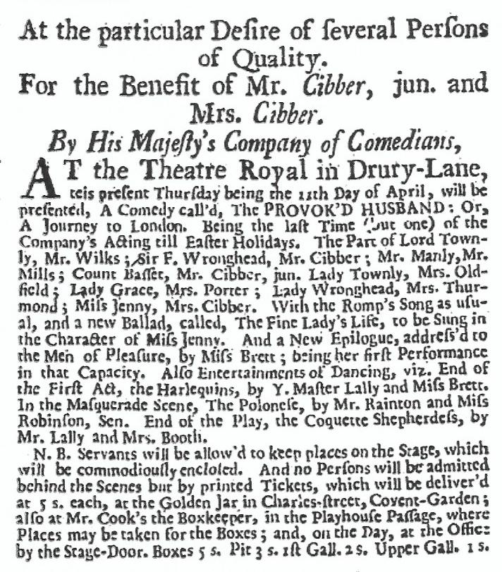 The scenic context for entr’acte dances must have been quite different. On 11 April 1728, The Provok’d Husband was performed at Drury Lane for the benefit of Theophilus Cibber and his wife. The play, adapted and completed by the actor’s father Colley Cibber from Sir John Vanbrugh’s unfinished A Journey to London, had proved extremely successful following its first performance on 10 January 1728. Its initial run of 28 performances was cut short only by the overwhelming popularity of The Beggar’s Opera, which opened at Lincoln’s Inn Fields on 29 January. The 11 April performance of The Provok’d Husband was the first for which entr’acte dances were billed in detail. Here is the advertisement in the Daily Post for 11 April 1728: