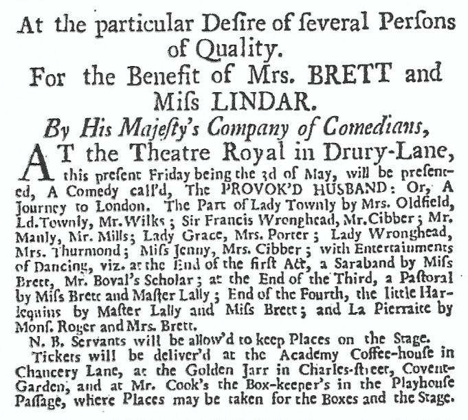 Later in the season, for a performance on 3 May 1728, the entr’acte dances were again billed in detail for a benefit with The Provok’d Husband as the mainpiece, this time for Mrs Brett and Miss Lindar. The differences between the two bills are interesting. Here is the advertisement from the Daily Post for 3 May 1728.
