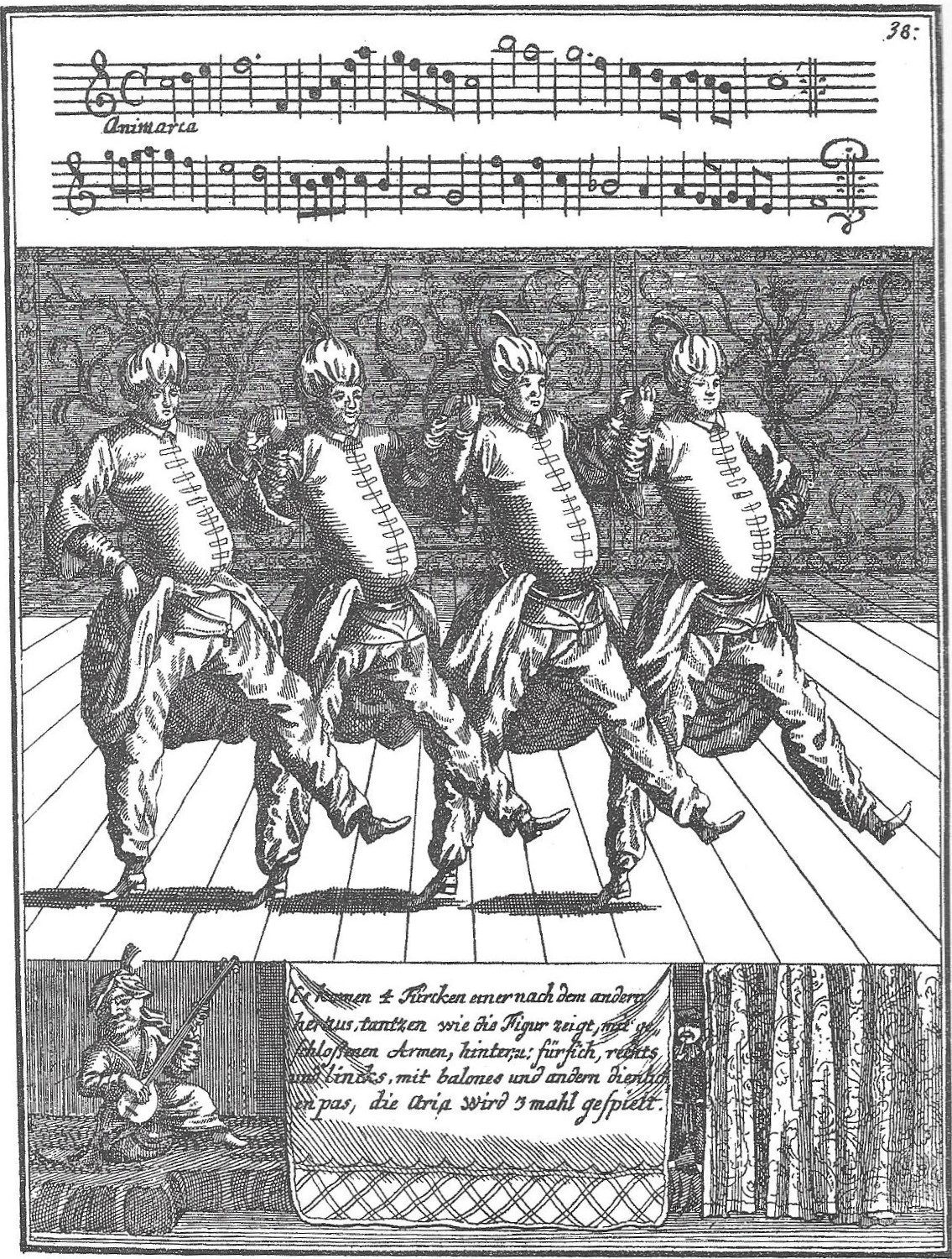 1719 was the year when Momus Fabuliste ou les Noces de Vulcain, a comedy by Louis Fuzelier and Marc-Antoine Legrand, was given at the Comédie Française. This was the source of the Momus Turn’d Fabulist performed in London some ten years later. The Introduction to the published text of the English ballad opera, in the form of a dialogue between a Player and a Gentleman, refers explicitly to the French play and praises the adaptation from a ‘French farce’ to an ‘English opera’. There is certainly more to be said about the figure of Momus and Momus Fabuliste, but my interest is (of course) in the dancing on the London stage. The frontispiece to the printed text of Momus Fabuliste provides a flavour of Momus as he appeared in the Paris farce.