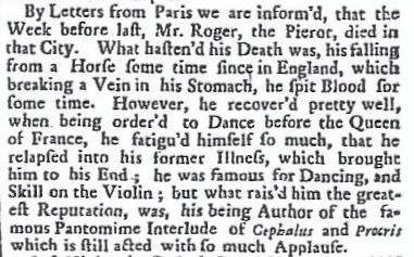 Tragically, Roger’s career was cut short by his sudden death in 1731 in Paris, reported in the Daily Advertiser for 11 November 1731.