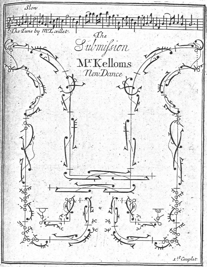 During the 1716-1717 season, the two children performed around a dozen entr’acte dances both serious and comic. Their repertoire included a ball dance by Kellom Tomlinson, The Submission first given on 21 February 1717 and published in notation the same year. The dance opens with a slow triple-time section, followed by a minuet and then a rigadon. Here is the first plate.