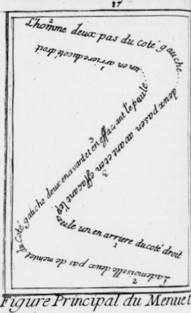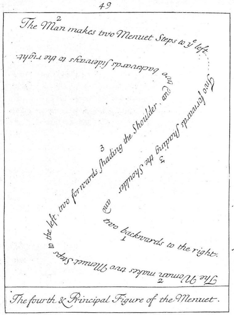 ‘The Weight of the Body being upon the left foot in the first position the right, which is at liberty, begins the Minuet Step, by making the Half Coupee or first of the four Steps belonging to the Minuet, in a Movement or Sink and Stepping of the right Foot forwards, the gentle or easy Rising of which, either upon the Toe or the Heel, marks what is called Time to the first Note of the three in the first of the two Measures, … the second Note is the coming down of the Heel to the Floor, if the Rise was made upon the Toe, but if upon the Heel or the flat Foot, in the tight Holding of the Knees before the Sink is made that prepares for the Fleuret or Bouree following, in which is counted the third and last Note of the Measure aforesaid; …