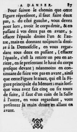 ‘This Menuet Step hath three Movements, and one March on the Toes; viz. the first is a half Coupee of the right Foot, and one of the left; a March on the Toes of the right Foot, and the Legs extended: At the End of this Step you set the right Heel softly down to bend its Knee, which by this Movement raises the left Leg, which moving forwards makes a Tack or Bound, which is the third Movement of this Menuet Step, and its fourth Step.’
