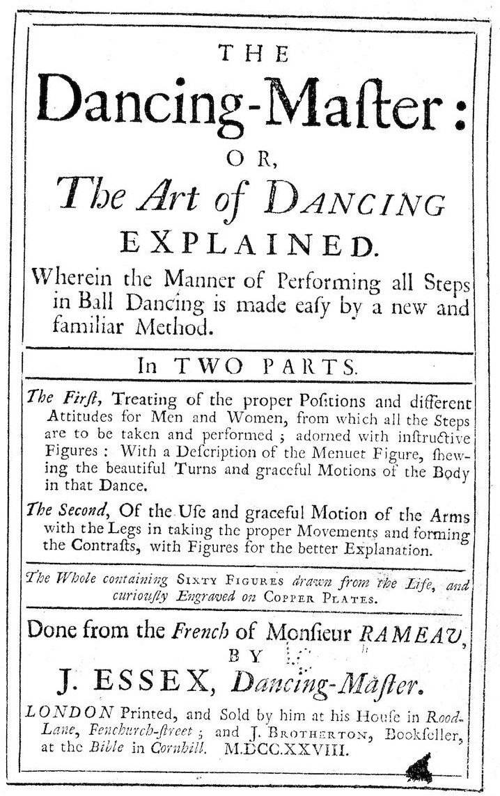When I find myself in doubt about an aspect of baroque dance technique, I generally go back to the early treatises – Pierre Rameau’s Le Maître à danser (Paris, 1725), with its translation by John Essex The Dancing-Master (London, 1728), and Kellom Tomlinson’s The Art of Dancing (London, 1735). Here is what Rameau (as translated by Essex) has to say about the pas de menuet ‘of only two Movements’: